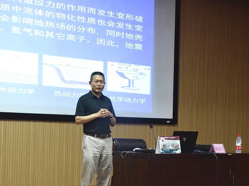 随后,杨教授从成矿流体、地震流体、环境流体等方面依次介绍了他的研究方向,并通过地壳介质受到的区域构造应力和物化性质变化等学科着重讲述了地震流体的成因。同时,杨教授还讲解了地震流体立体观测示意图。杨教授以理论分析和数值模拟为研究方向,研究深部地质流体、构造形变、地应力、地球化学和地热场之间的耦合关系,并定量分析这种耦合关系与地震活动之间的内在联系。此外,他向与会的师生介绍了团队近期的重点研究方向:一是以漓江附近的铅锌尾矿库为具体研究对象的多金属尾矿库对周边水资源和土壤的环境污染;二是以桂林会仙湿地为具体研究对象的化肥和农药等农业面源对周边水资源和土壤的环境污染。